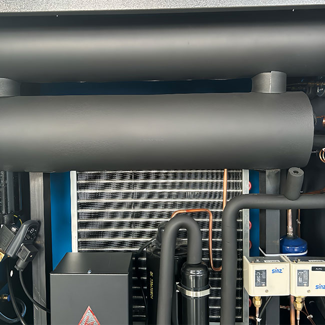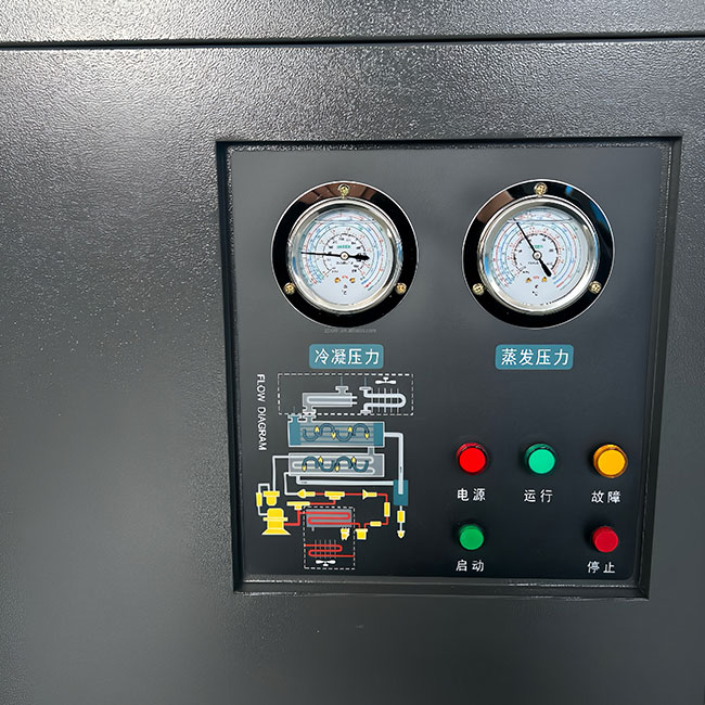 This refrigerated compressed air dryer employs advanced refrigeration technology to rapidly lower the temperature of the compressed air, causing the water vapor within to condense into liquid form and be efficiently separated and discharged. Its uniquely designed heat exchanger increases the utilization rate of the cooling capacity.